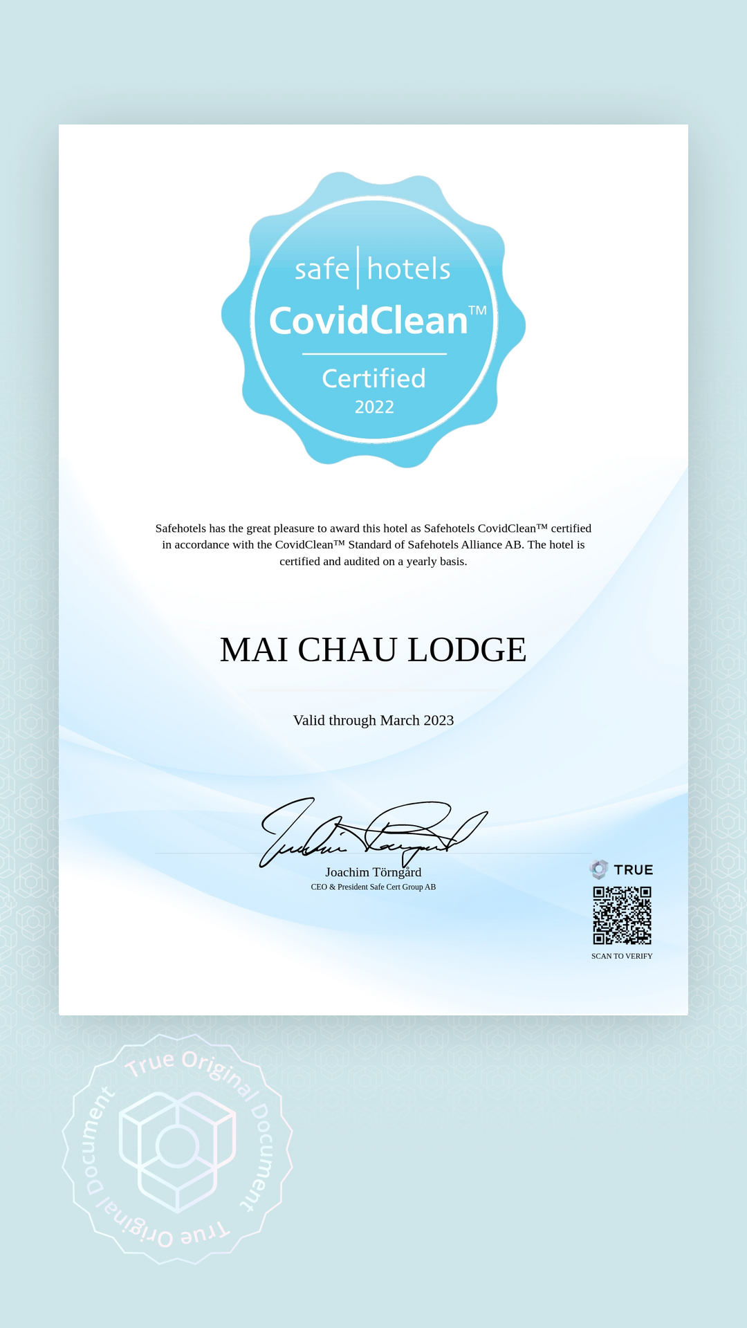 All TRUE documents are secured with blockchain technology and can therefore always be verified as authentic. Anyone can verify a document by clicking the verification button on the published document, or scanning the QR code on a printed copy. No app or third party is required – just a smartphone camera.